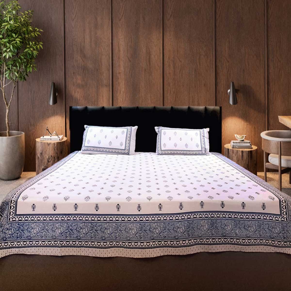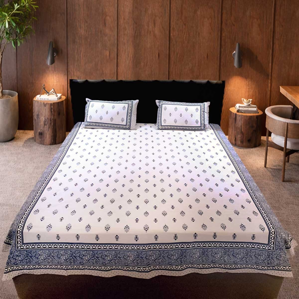 Timeless Artistry for Your Home Bring the charm of traditional craftsmanship to your bedroom with this stunning white-base bedsheet. Adorned with sophisticated Indigo and Cerulean blue floral motifs, the intricate pattern creates a serene, high-end look that fits perfectly in both contemporary and ethnic interiors.