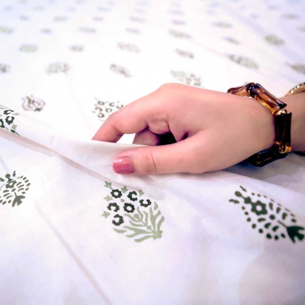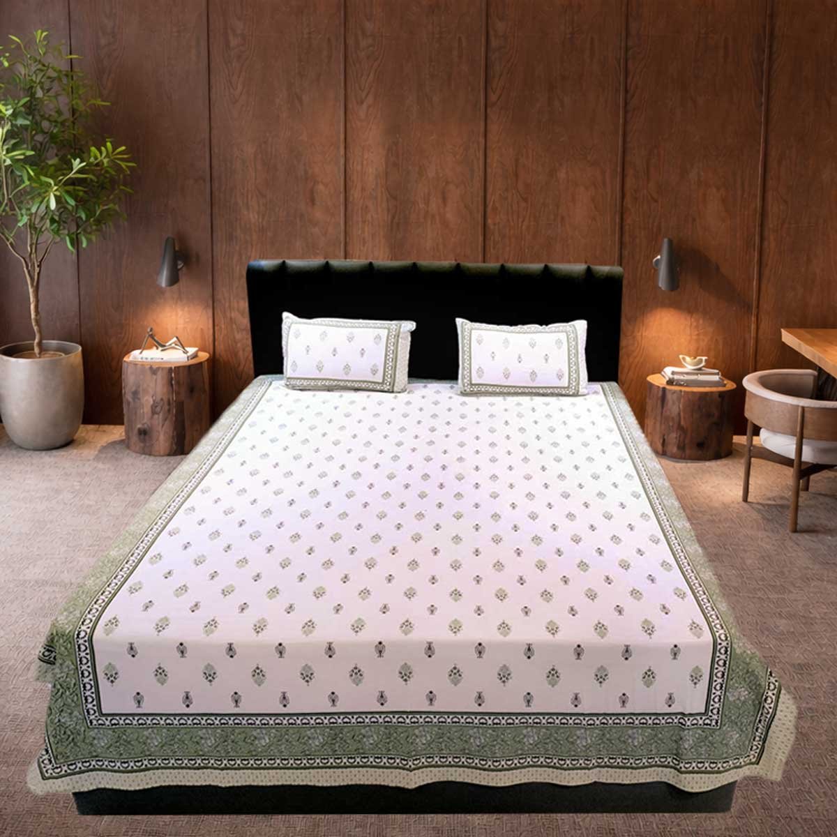 Embrace simplicity with the Senora Sage Green King Size Bedsheet. Featuring delicate floral “booti” prints in a calming sage green on a pristine white base, this 108×108 inches bedsheet is made from 180 TC cotton. Perfect for creating a peaceful and airy bedroom environment. Comes with 2 matching pillow covers.